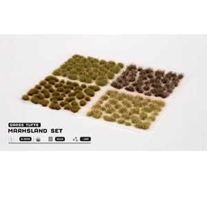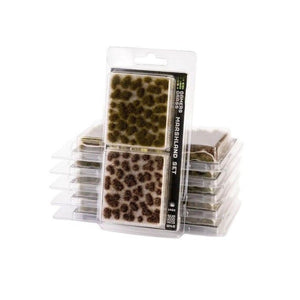 This colour set includes a diversity of tufts with green, brownish, and light tips, with darker brown bases. They simulate waterlogged or sunless plants under a shadow. Best used to recreate marsh and peat landscapes, or shadowy grasslands, undergrowth dark forests and scrubs.