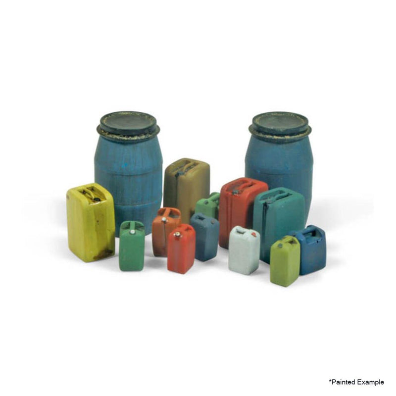 Fourteen assorted modern plastic drums used for transport of liquids, in different sizes, from size 10 to 50 litres and 50 to 120 litres.